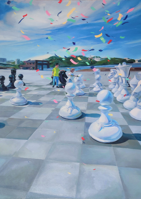 110×80см х. м. 2025 г В тех городах, в которых я была, есть свои места притягивающие людей. Это бывают памятники, арт-объекты, деревья, парки, дворы. Они как оазисы в пустыне — питают, вдохновляют, дают силы для новых побед. Иногда эти сочетания бывают чересчур необычными на грани сюрреализма. Такие точки вбирают в себя историю, которой пронизан город, современную архитектуру, взгляды, ландшафт и быт. Я люблю оказываться в таких местах и иногда случайно. И люблю наблюдать за городом. Еще мне нравится, как меняется город в разное время суток. Утром в парках гуляют дети, днем подтягиваются те, кто ушел на заслуженный отдых и теперь играет в шахматы с другими пенсионерами, вечером лавочки заполоняют подростки, а ночью приходят те, кому не спится, в поисках другой темной жизни. В выходные смешиваются все ингредиенты, и места одновременно заполоняются людьми разных интересов, возрастов и достатков. Особенно дорожу такими моментами, кода улицы пустеют и пространство является само по себе. Тогда, если встретить какого-нибудь одиночку, пространство как бы обнажает его душу и становится видно то, что легко скрыть в толпе или в повседневном общении.
