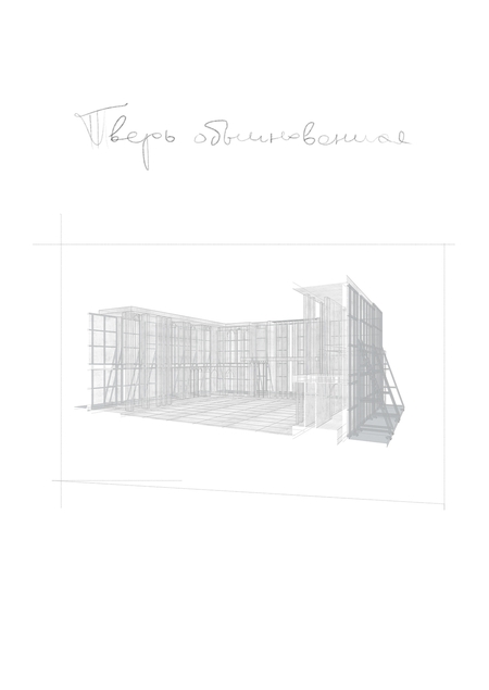 Пространство Театра — условная «коробка» — павильон с четырьмя уходящими вверх стенами. Вся структура пространства основана на минималистичных геометрических формах — колоннах, арках, прямоугольных блоках. Бытовые предметы, появляющиеся в сценарии, заменены на условные «модули» — объекты простой формы, в которых сохранена только функция. Всё пространство светлое, основная фактура — фактура светлого бетона.