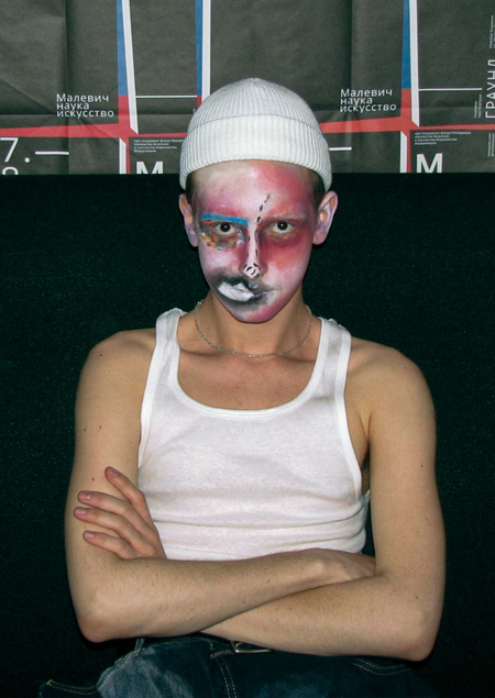 Арен — главный герой, поэтому его грим должен привлекать внимание. Для грима я использовала яркие разные цвета как метафору многогранности эмоций и чувств персонажа. Одна сторона лица более чёткая, другая размазанная, «стёртая» — образ поплывшей личности Арена после убийства друга — она же в цветах открытой раны. Смещённый чёрно-белый (словно мёртвый) рот символизирует невозможность Артемия выражать свои чувства словами