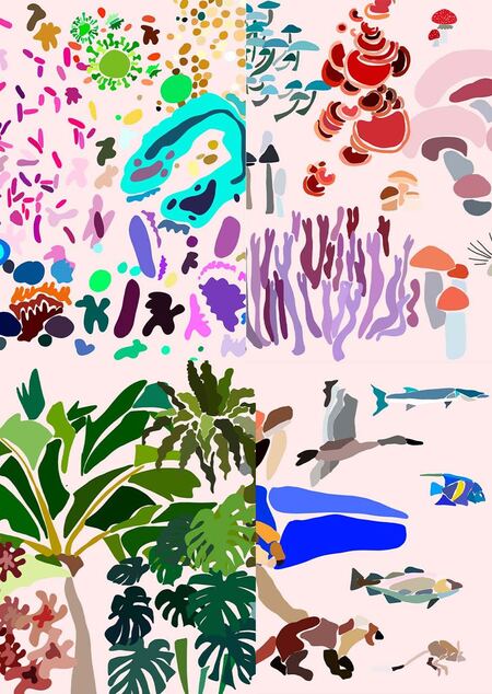 Иллюстрации посвящены Дарвинскому музею, находящемуся в Академическом районе Юго-Западного округа Москвы. Каждая градирня олицетворяет царство живой природы в порядке их появления на земле: бактерии, грибы, растения и животные.
