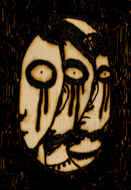 Для создания плакатов к обоим произведениям, я использовала технику выжигания по дереву. Мой выбор обусловлен тем, что я буду иметь возможность создать нечто животное, хаотичное и дикое, благодаря неряшливым линиям. В данном контекст тёмные выженные линии также ассоциируются с чем-то отрицательным.