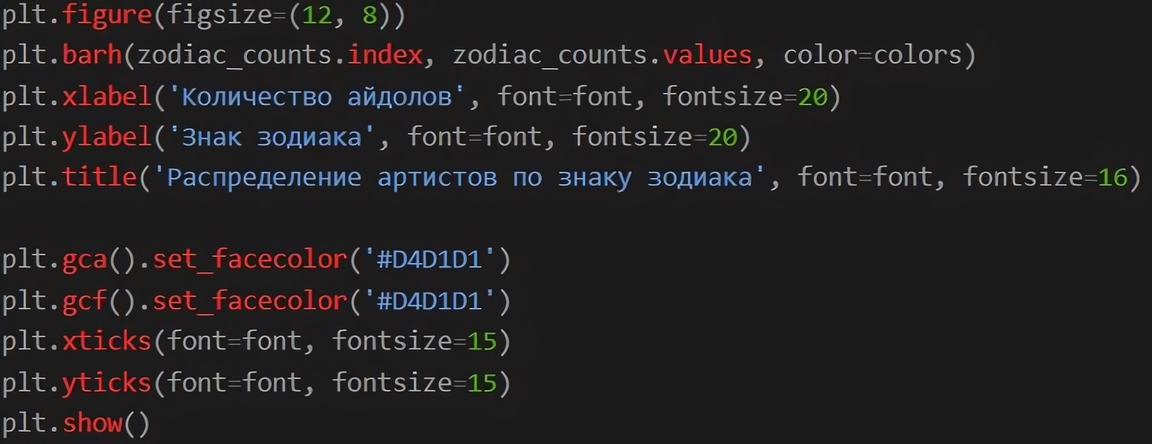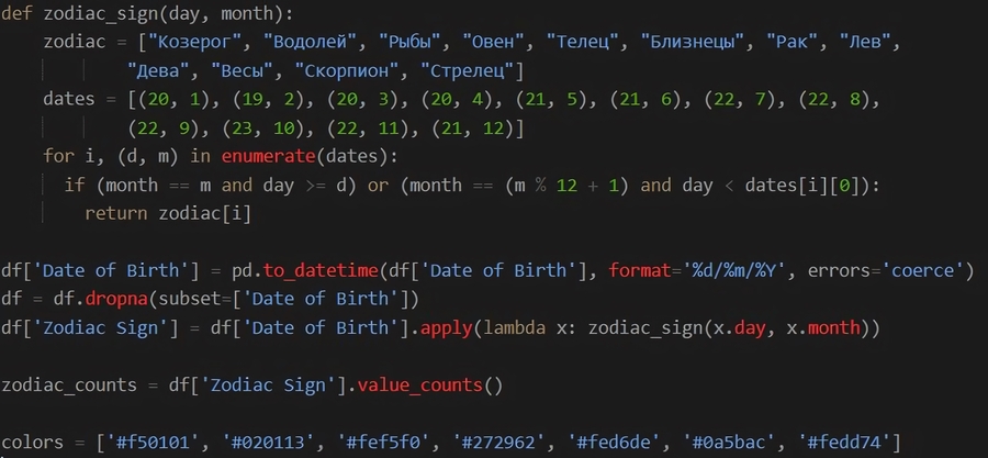 При работе я использовала нейросеть Chat GPT (https://chatgpt.com/) для того, чтобы исправлять непонятные для меня ошибки. Также я пользовалась им для того, чтобы разобраться с тем, как изменить цвет фона и колонок. Кроме того, он помог сформулировать код для графика со знаками зодиака.