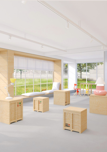 Концепция общей зоны — выставка объектов, созданных в студии, и сама зона для проведения воркшопов. При помощи мебели и материалов достигается атмосфера мастерской, где нет препятствий для полета фантазии.