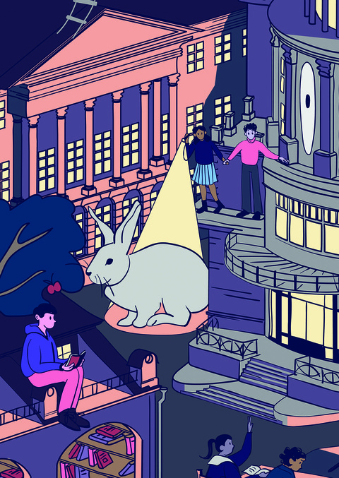 Исследовать мир вокруг нас можно разными способами: кто-то предпочитает часами засиживаться в библиотеке, кто-то бороздит просторы интернета в поисках новой информации, кто-то берет в руки фонарик и идет освещать им мир вокруг. В данной иллюстрации я попыталась изобразить всю многогранность учебного процесса в НИУ ВШЭ.