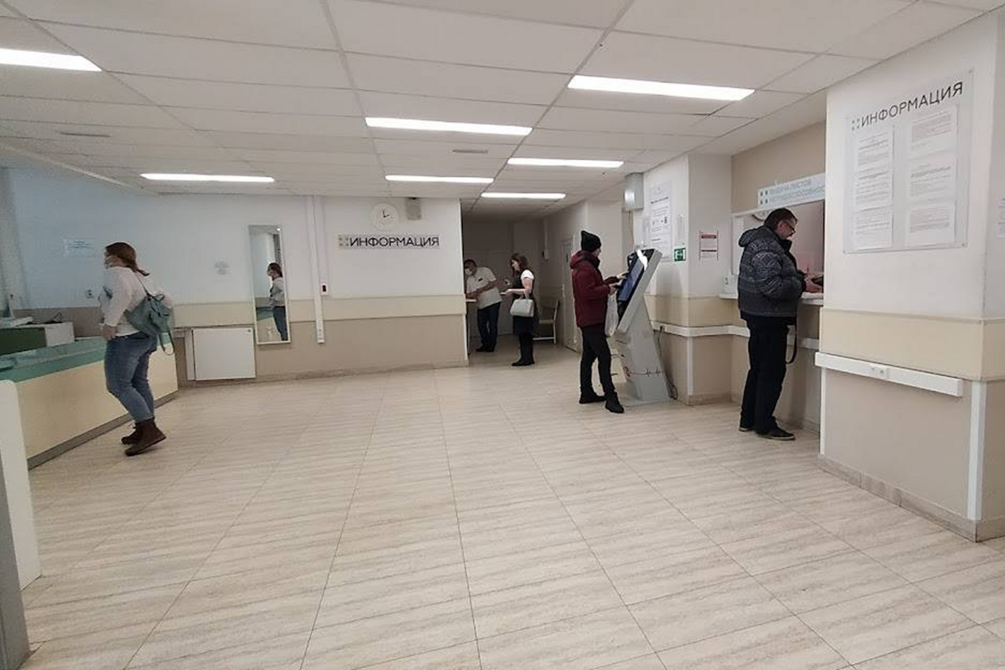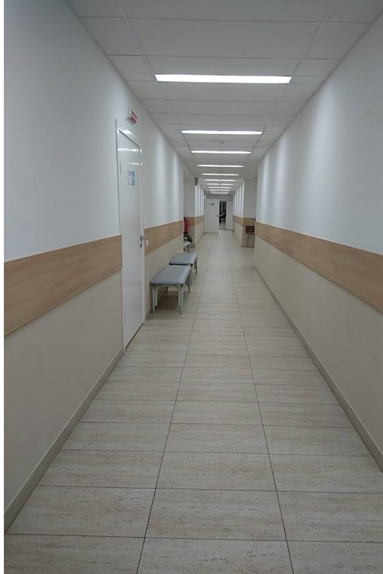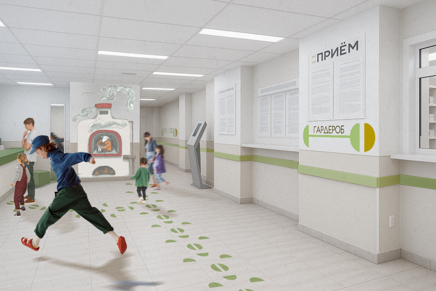 Следуя за цветными следами через зону регистратуры, посетители попадают к кабинетам врачей.