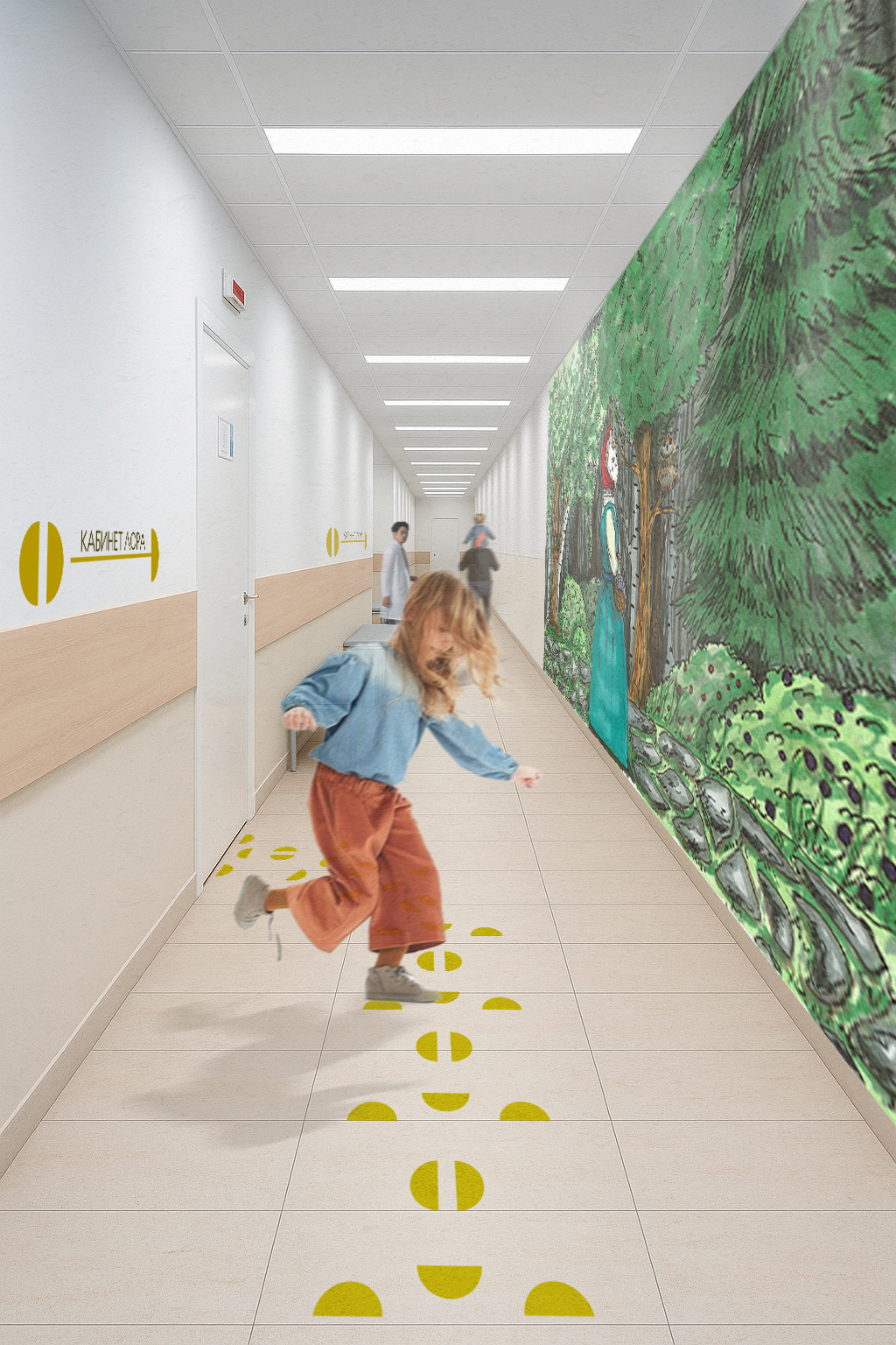 Задача проекта — создать добрую, яркую и запоминающуюся айдентику, которая преобразит городскую поликлинику. Неслучайно выбрана сказка: каким бы «хищником» ни казалась болезнь, маленькому пациенту непременно помогут ее одолеть тут, в метафоричном лесу детской поликлиники.