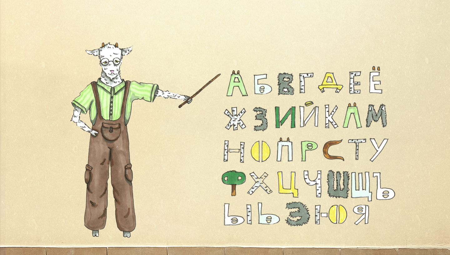 В рекреации располагается иллюстрация с алфавитом. На него указывает старший козленок.