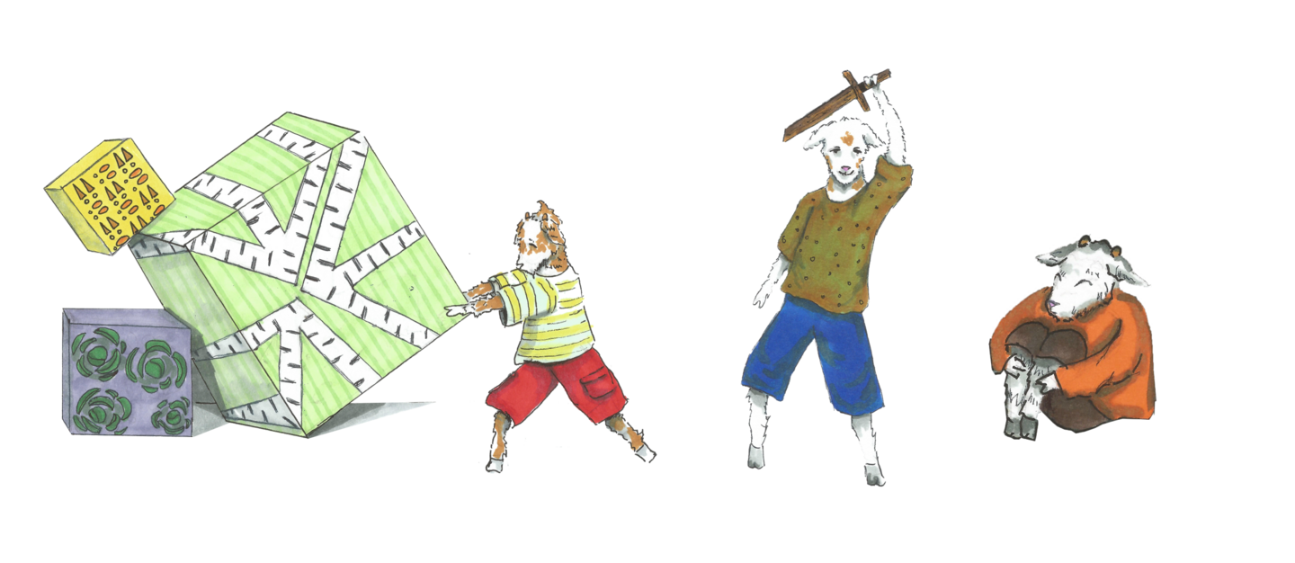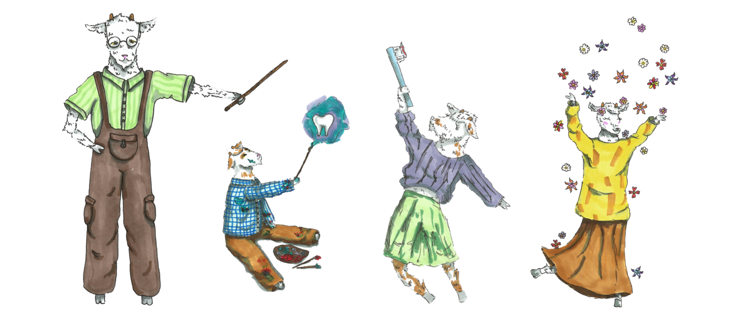 Главные персонажи иллюстраций — козлята. Все они имеют уникальные черты, характер и особенности. Их индивидуальность отражена через цвета и атрибуты.