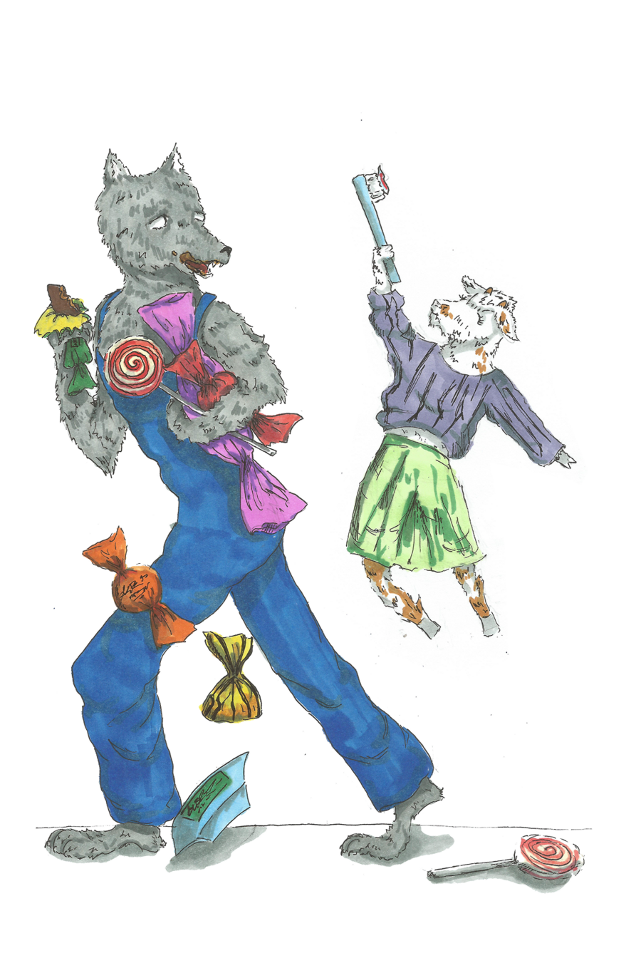Иллюстрации внутри кабинетов отоларинголога и стоматолога. Здесь дети впервые встречают волка, который, как оказывается, тоже посещает поликлинику.