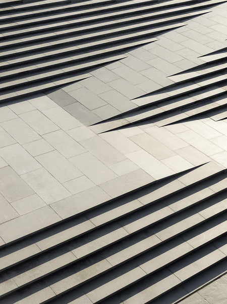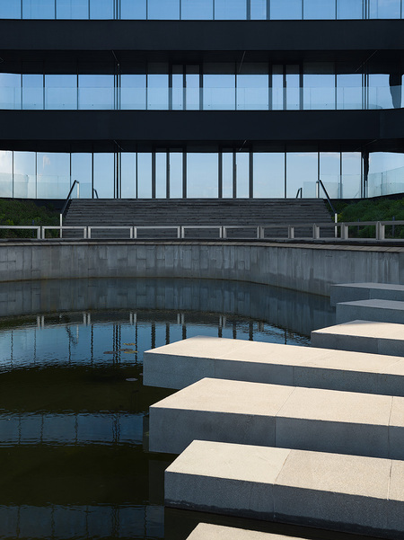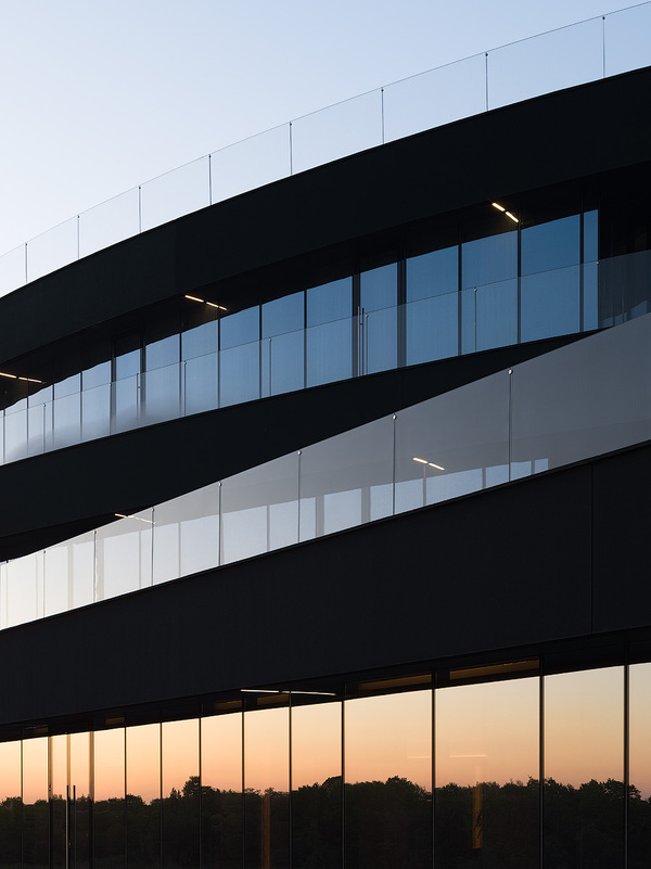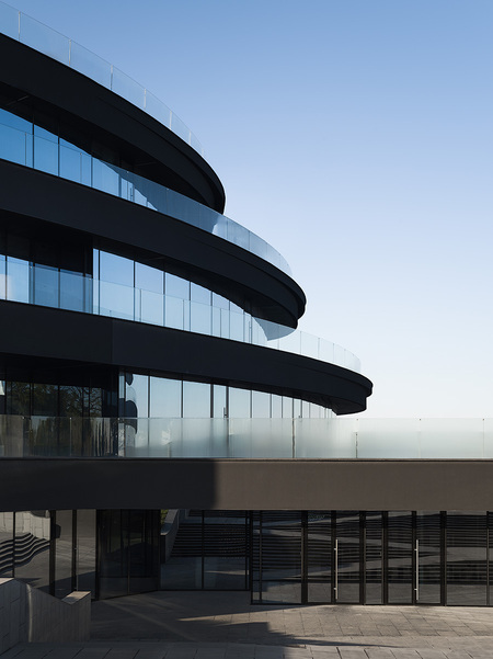 Each building in the plan resembles an ellipse. Each subsequent floor is smaller in area than the previous one, due to which the building acquires a dynamic appearance. The buildings are turned relative to each other in such a way as to provide the best views of the interior spaces. A cascade of terraces, benches and steps, «flowing» down the coastal slope, harmoniously connect the building with the surrounding landscape.
