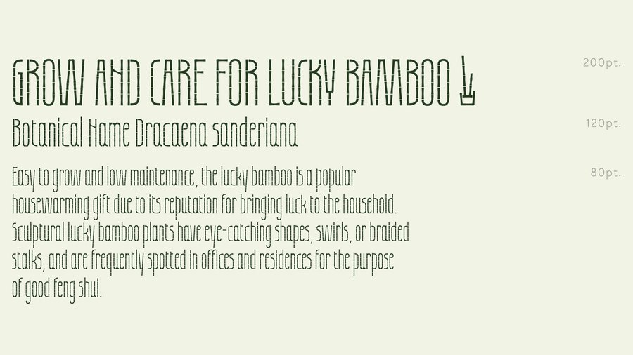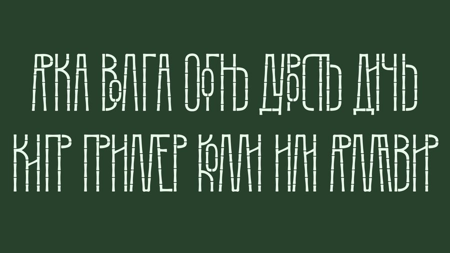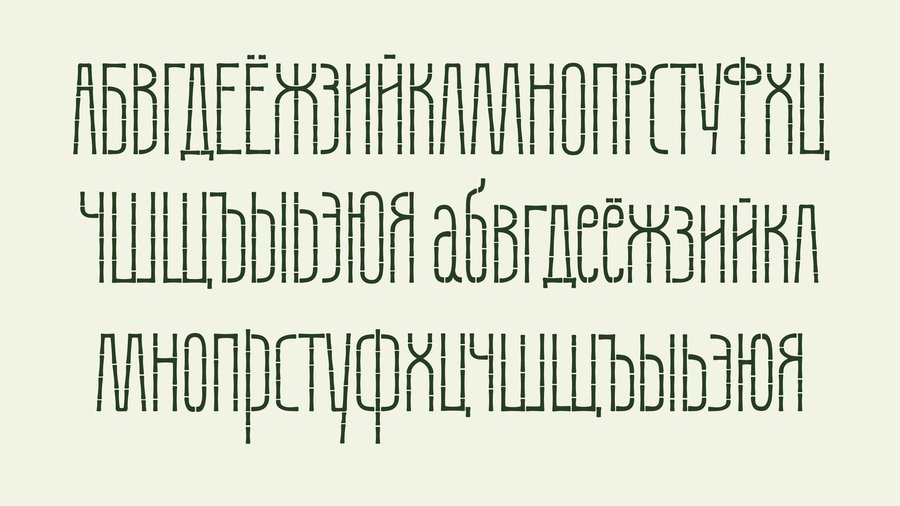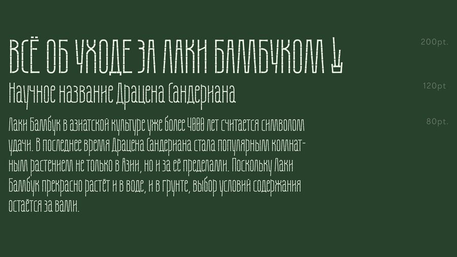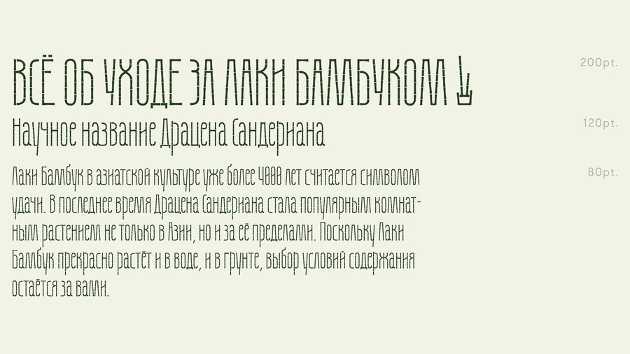 Акцидентный разбалансированный гротеск вдохновлённый комнатным растением и русской вязью. Он забавный, местами странный и неровный, одним словом — живой!