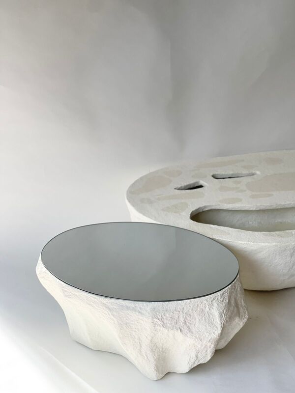 SAYAN AND POLUI COFFEE TABLES ARE CREATED WITH THE PHILOSOPHY OF AFFORDABLE DESIGN AND RESPECT FOR NATURE FROM RECYCLED PAPER AND GLASS. THEY ARE STRONG DUE TO THE CELLULAR FRAME. COATED WITH A GLAZE OF MARBLE DUST AND LATEX, IT GIVES A FEELING OF COOLNESS TO THE SATIN STONE AND A VISUAL RESEMBLANCE TO CERAMICS. IT CAN BE WASHED.