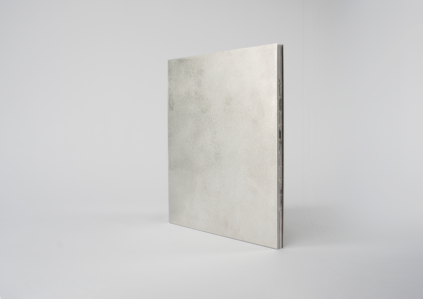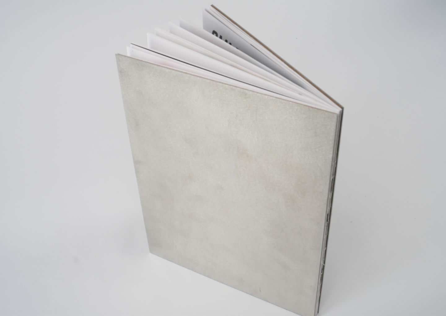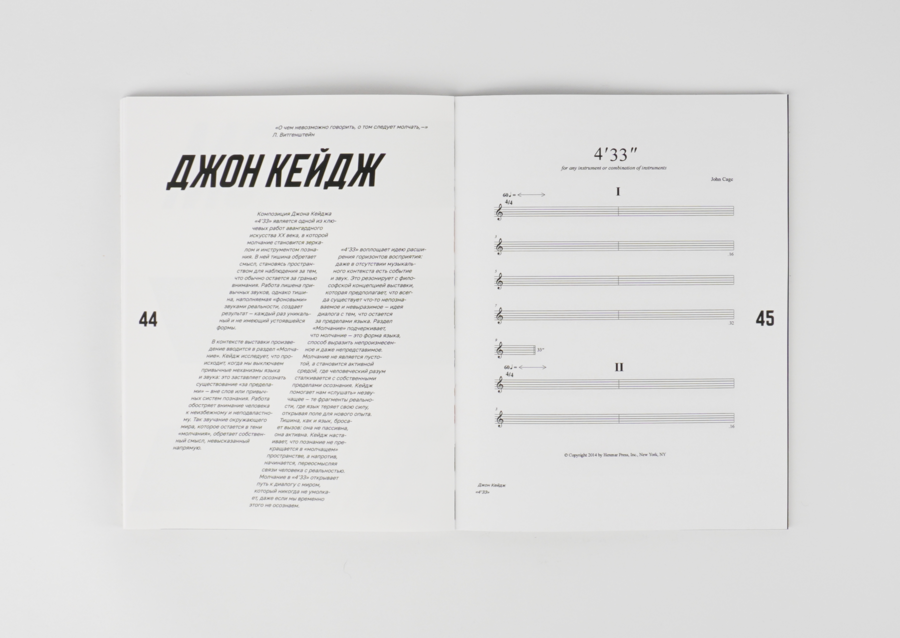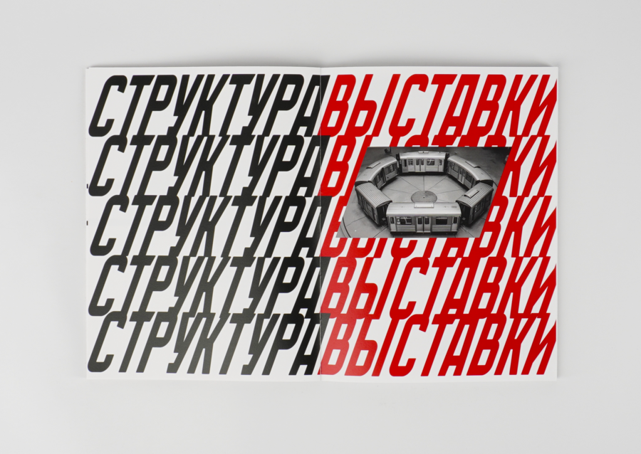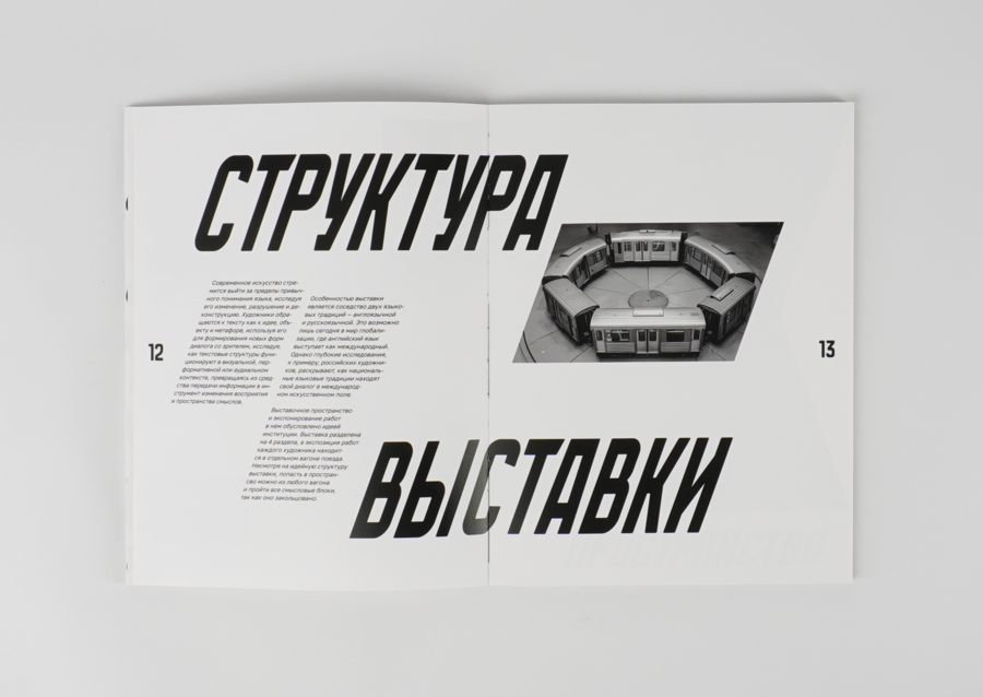 Вёрстка каталога: текстовые блоки расположены хаотично, под углом 20 градусов к стандартным линиям. Подобное топографическое решение создаёт динамику, продолжая диалог с работами художников. Обложка издания выполнена из металла, материал соотнесен с выставочным пространством.