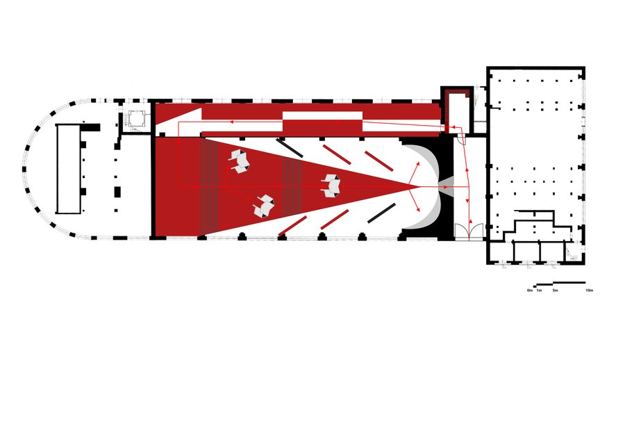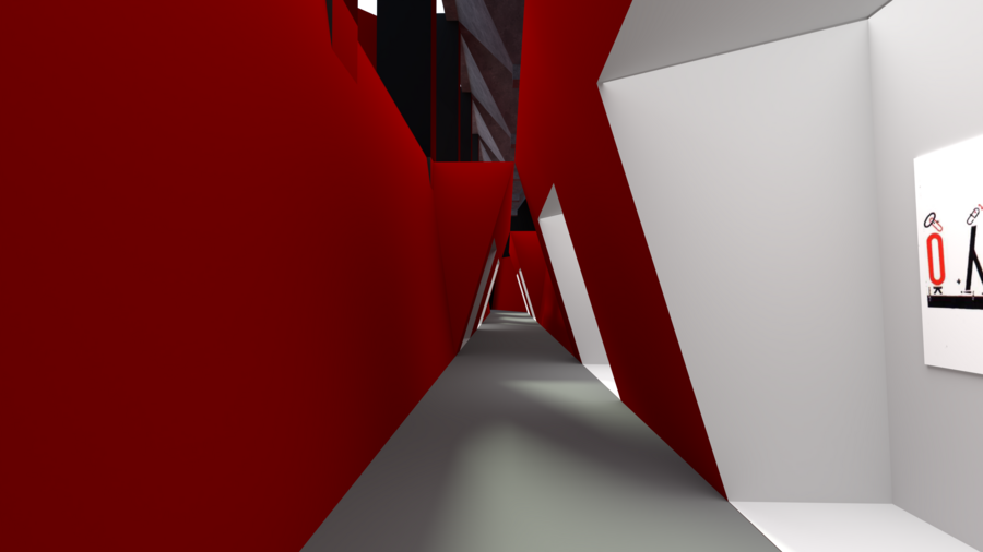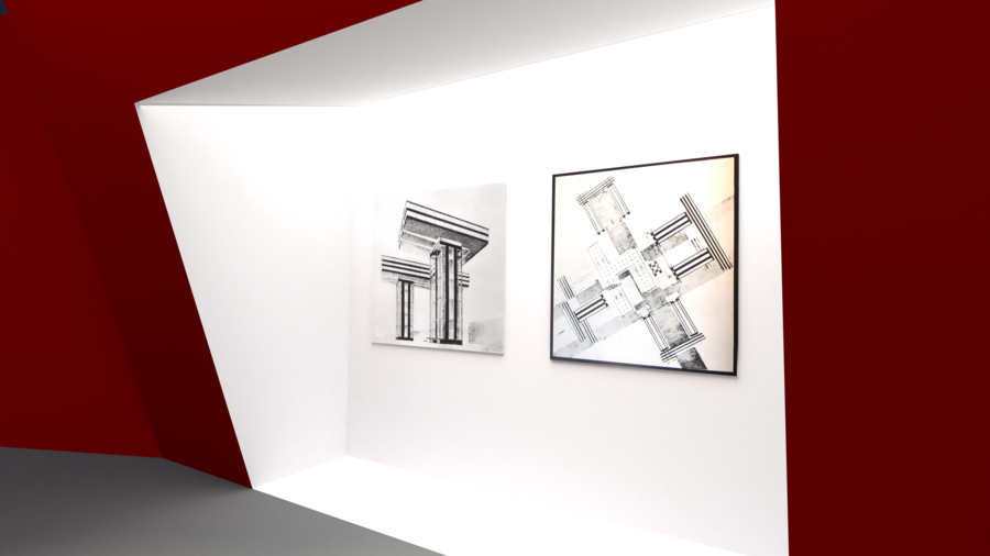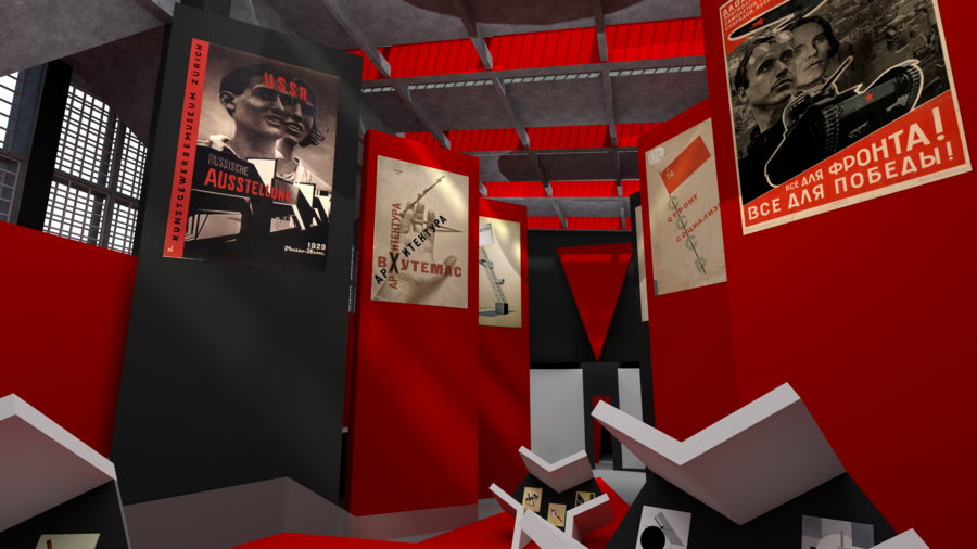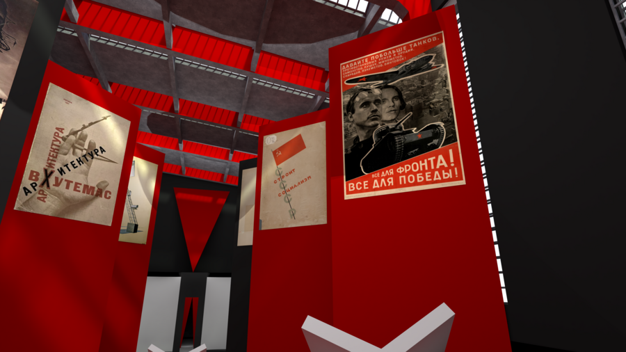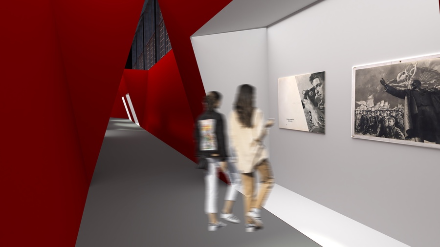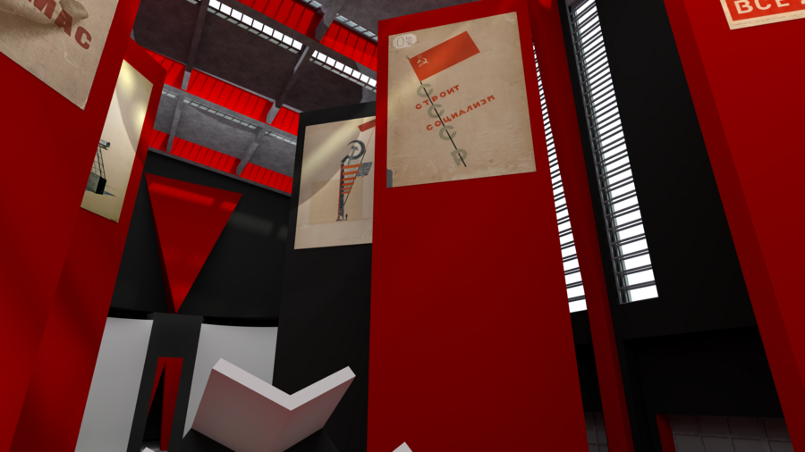 Главный зал выставочного пространства подобен одному из его плакатов «Клином красным бей белых». Посетители спускаются вниз по большому красному клину, рассматривая поочередности наследие Лисицкого и приходят к конечной и немного непривычной эмоциональной точке.