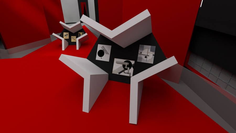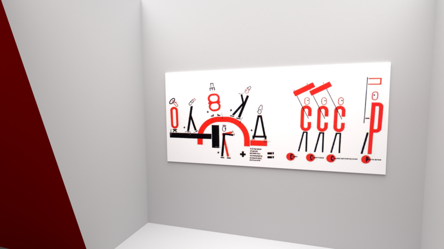 Так же на лестничных площадках стоят 3 стенда в виде ПРОУНов Эль Лисицкого, на которых можно увидеть остальные работы, выполненные в том же духе.