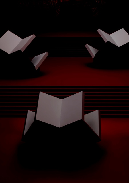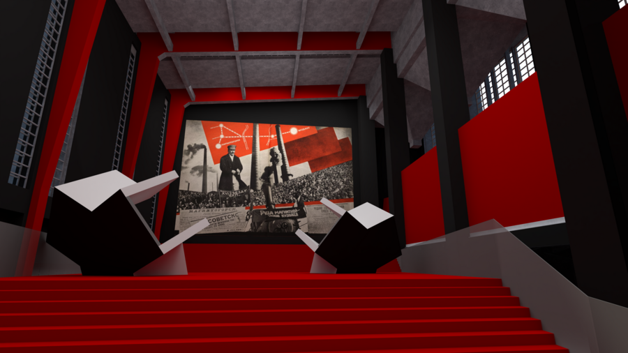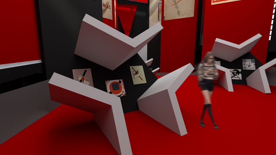Внизу зрителей ждут два больших экрана, которые полностью погружают в атмосферу и перекликаются с цитатой Эль Лисицкого: «Холст для меня стал слишком тесен. Круг цветовых гармоний стал для меня слишком узок. И я создал ПРОУНы — как пересадочную станцию от живописи к архитектуре».