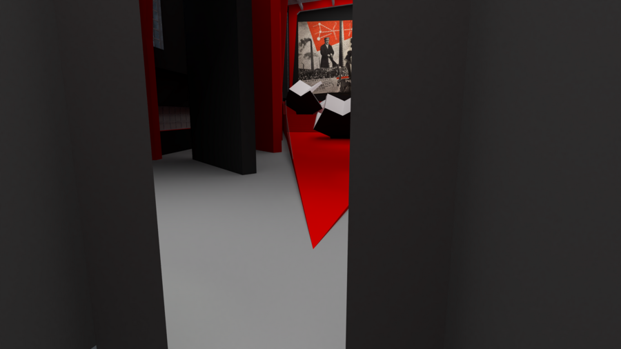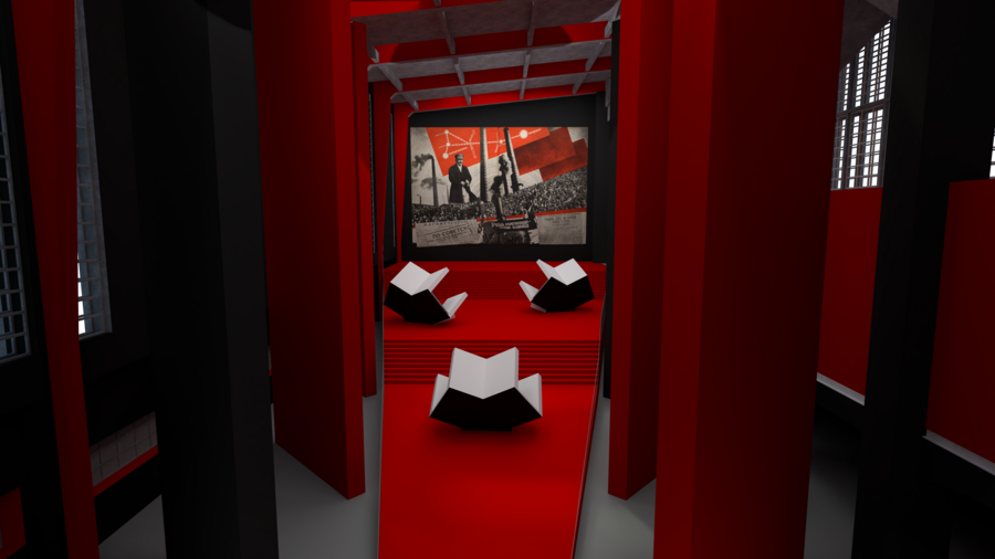 Далее основной зал, который повторяет плакат Лисицкого «Клином красным бей белых». Вниз зрителей спускает большая красная лестница в форме клина.