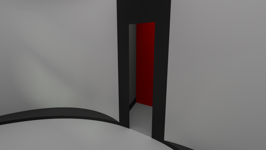 Длинный коридор с наклоненными стенами и углублениями для картин создает ощущение туннеля, который заканчивается чем-то неизвестным и интригующим.