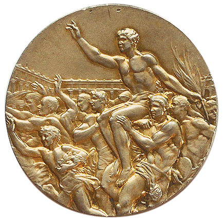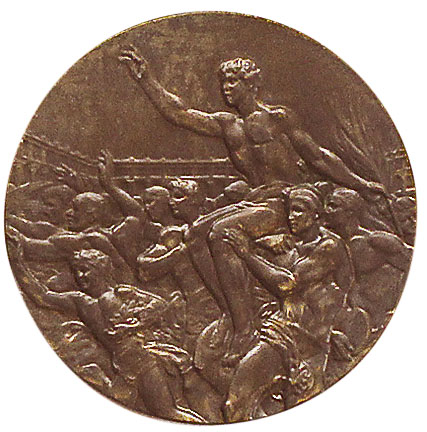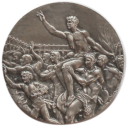 Реверс: ликующие атлеты несут на плечах победителя-триумфатора. Его правая рука поднята в приветствии, в левой — пальмовая ветвь. На заднем плане очертания стадиона. Справа, у края медали, инициалы итальянского художника: «G. C.».