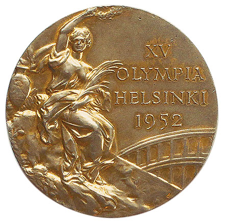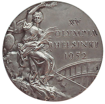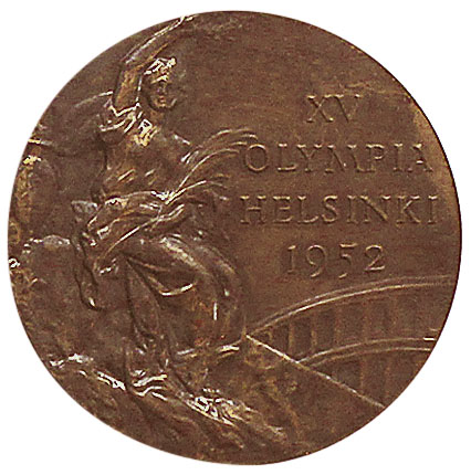 Аверс: богиня победы с лавровым венком, пальмовой ветвью, панафинейской амфорой и напоминающим римский Колизей амфитеатром. Над ним текст в четыре строки: XV OLYMPIA HELSINKI 1952 (XV Олимпиада Хельсинки 1952).