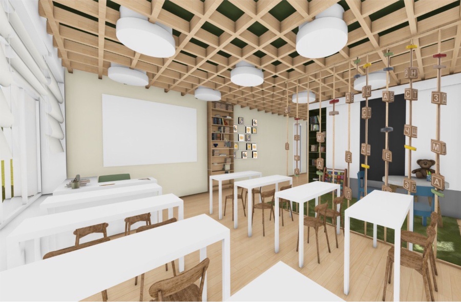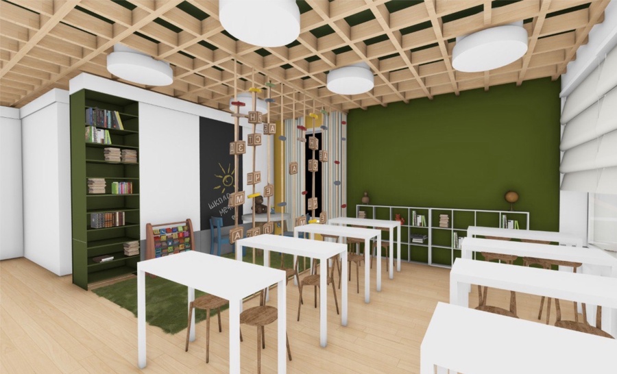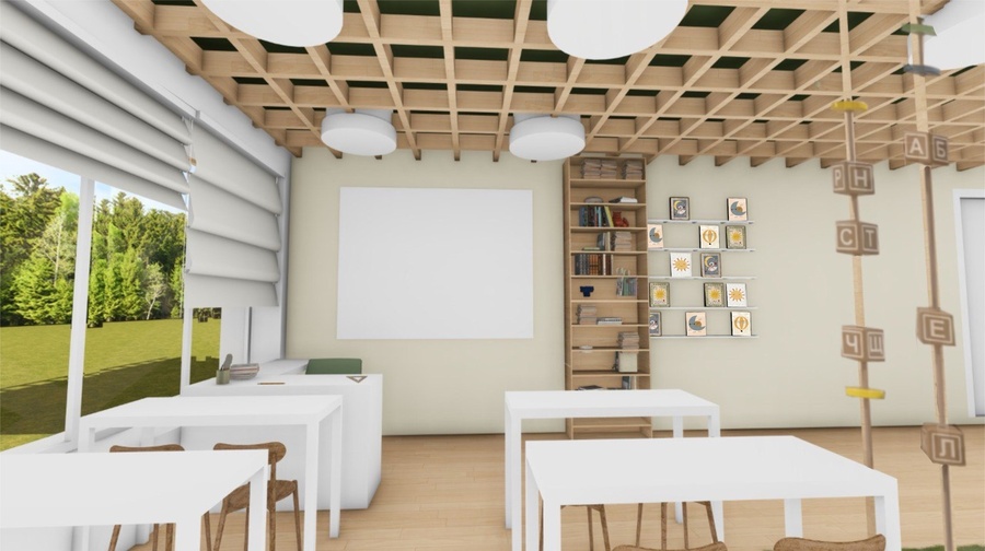 Особое внимание уделено эргономике и безопасности: регулируемые парты и стулья с поддержкой осанки, столы с вырезами для колясок, мягкие ортопедические модули в зоне отдыха, мебель без острых углов, с гипоаллергенной обивкой.