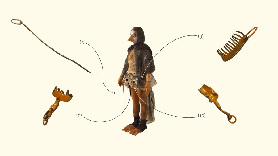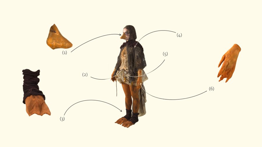 (1) клюв (2) платье (3) туфли-лапки и онучи (4) шаль-накидка (5) пояс (6) перчатки-лапки (7) дирижерская палочка (8) грабельки (9) гребень (10) лопатка