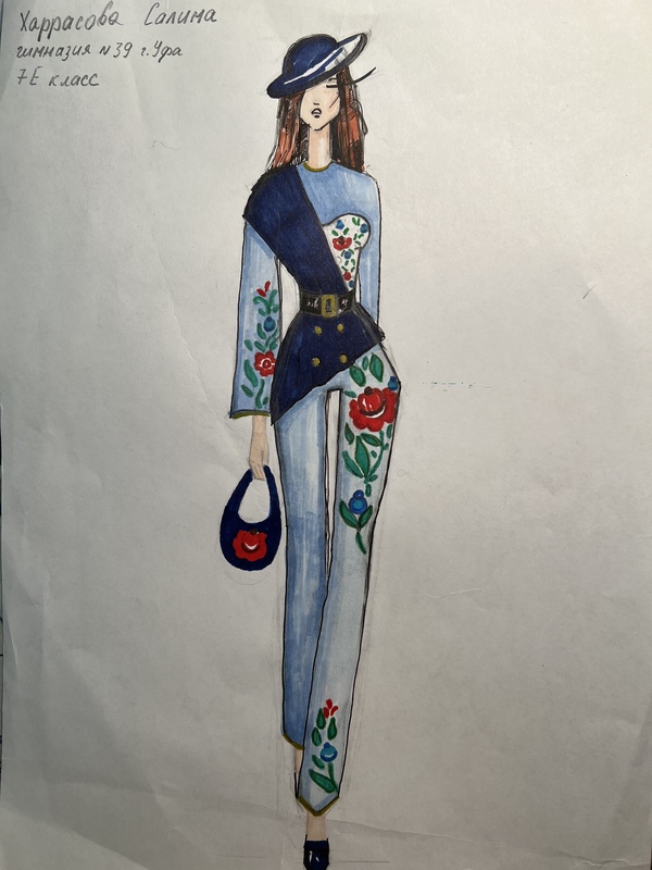 Представлен современный брючный костюм с элементами городецкой росписи. Преобладающая цветовая гамма — голубой и синий. Такой костюм можно одеть и на деловую встречу, и можно использовать для повседневного образа. Элементы городецкой росписи придают особую изысканность и неповторимость.