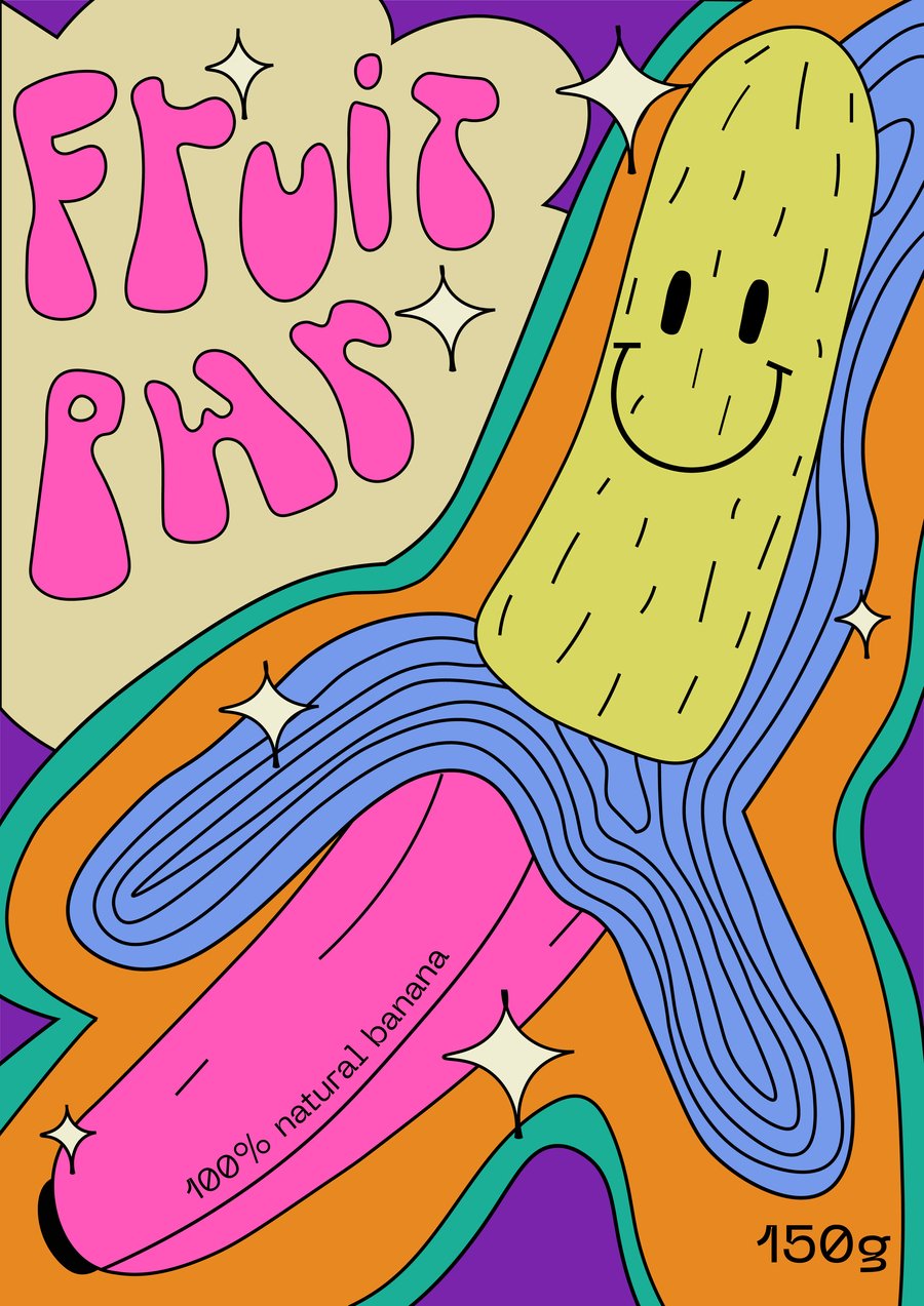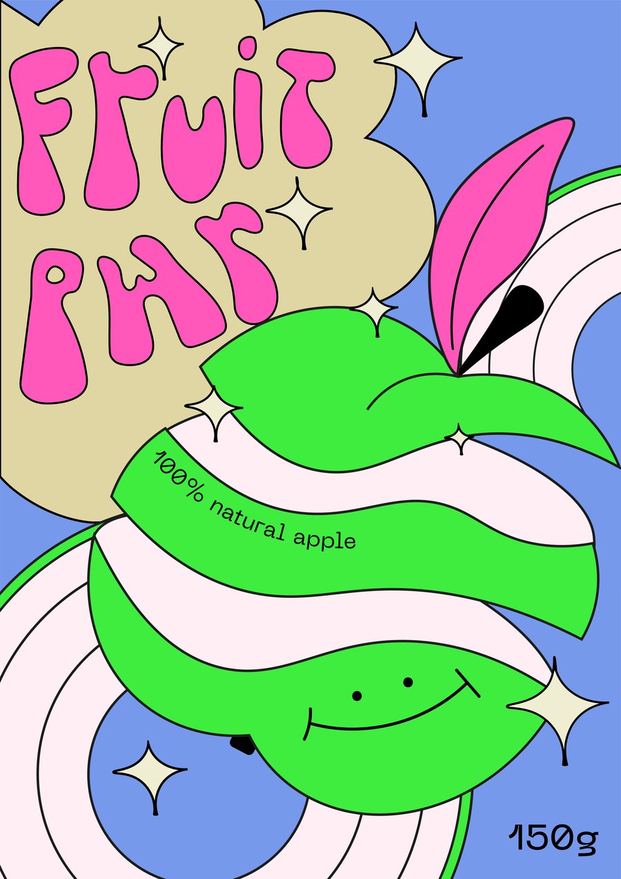 FRUIT POWER — это фруктовые чипсы, вдохновленные культурой хиппи и визуальным стилем 70-х. Название — это отсылка к движению Flower Power, которое было символом мира, любви и свободы, хиппи активно поддерживали эти идеи. Они также носили яркую одежду и украшения, которые были символом их культуры. Их музыка была громкой и энергичной, а вечеринки — веселыми и свободными. Это настроение любви к миру, яркости и заряда идеально подходило к упаковке такого продукта, как натуральные и сладкие фруктовые чипсы. Вдохновляясь стилем хиппи, я использовала яркие цвета, шрифты рукописного вида для создания ощущения индивидуальности и свободы. Центром композиции каждой упаковки стал персонаж-психоделичный фрукт, который в том числе является переосмыслением растительно-цветочных мотивов хиппи эстетики.