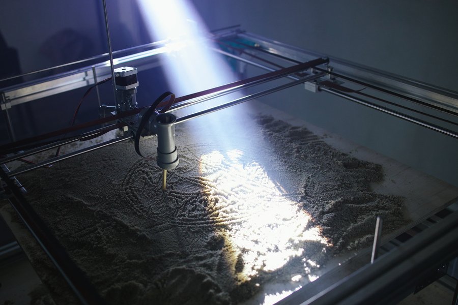 Роботизированная инсталляция, созданная в сотрудничестве с инженерами МИЭМ НИУ ВШЭ, печатает образец псковского зодчества в формате гравюры, изображающей дикого зверя Китовраса (XII в.).