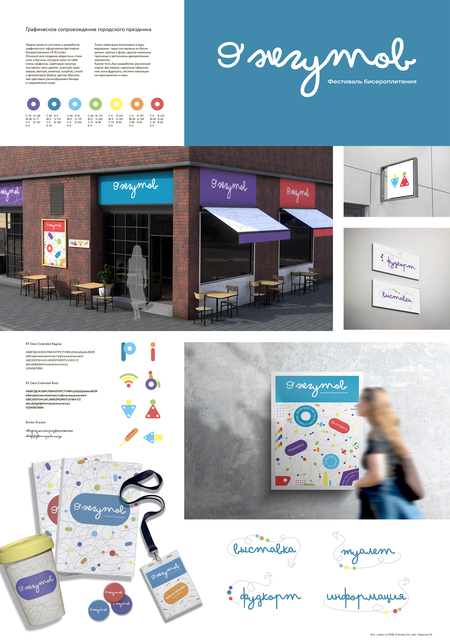 Основой для создания айдентики стали нить и бусины, которые сами по себе очень графичны. Цветовую палитру составили семь цветов: красный, оранжевый, желтый, зеленый, голубой, синий и фиолетовый. Выбор цветов обусловлен цветовым разнообразием бисера в современном мире. Знаки навигации выполнены в двух вариациях: одни составлены из бусин разных цветов и форм, другие написаны прописью и дополнены декоративным элементом. Кроме того, был разработан рекламный плакат фестиваля, наружное оформление зоны фудкорта, система навигации на мероприятии и сувенирная продукция.