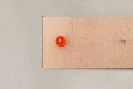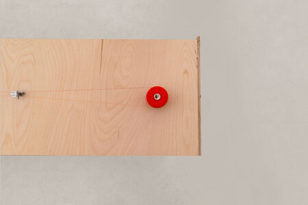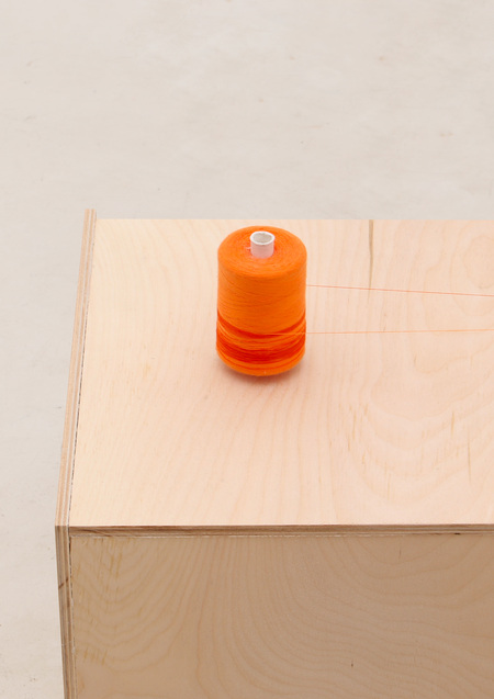 Инсталляция представляет собой конструкцию из двух взаимосвязанных бобин, наматывающих и разматывающих нити в бесконечном цикле. Это движение — парадокс взаимодействия хаоса и упорядоченности, где любая попытка систематизации неизбежно порождает новое смещение.