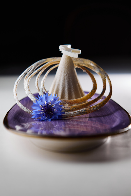 «Dedicated specifically to the woman-cosmonaut, the dessert reflects a blend of fortitude and true grit with tenderness and a flaming heart. A woman with a touch of mystery, with a surprise woman, because she is unique!It’s an incredible combination for an incredible person. The filling is made from our native raspberries with a delicious surprise — green basil. The crispy circles represent the turns of the spacecraft. A living cornflower serves as a symbol of the Russian field, and, of course, a chocolate white seagull — the callsign of Valentina Vladimirovna!That’s how I felt it!»