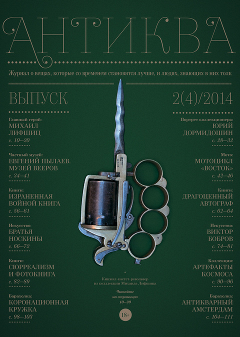 Главный герой номера: Михаил Лифшиц — директор по развитию высокотехнологичных активов Группы Компаний «РЕНОВА», предприниматель, путешественник и коллекционер короткоклинкового холодного оружия — делится с «Антиквой» историями о занимательных предметах из своей обширной коллекции: «Там очень смешной этот текст, прикольный, добрый: „Этим ножом я, Хосе Гуэльо, убил своего врага Хосе Мартинеса, чем выполнил волю предков“. Я для себя рассудил, что ну его, этого Мартинеса!»