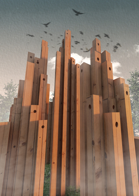 Арт-объект «Птичий квартал» представляет собой 90 домиков для птиц, каждый из которых символизирует один из гнездующихся в Юнтолово вид.