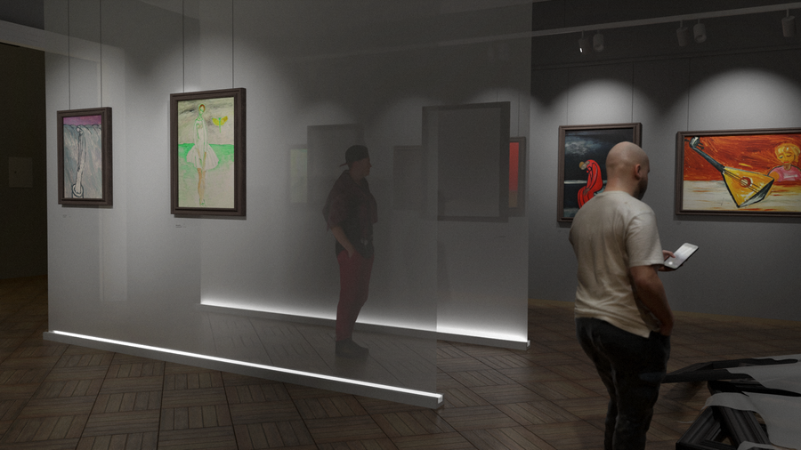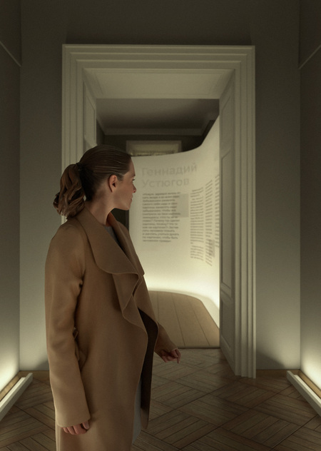 В углублениях зала представлены архивные фото художника. Посетитель может самостоятельно приоткрыть шторку.
