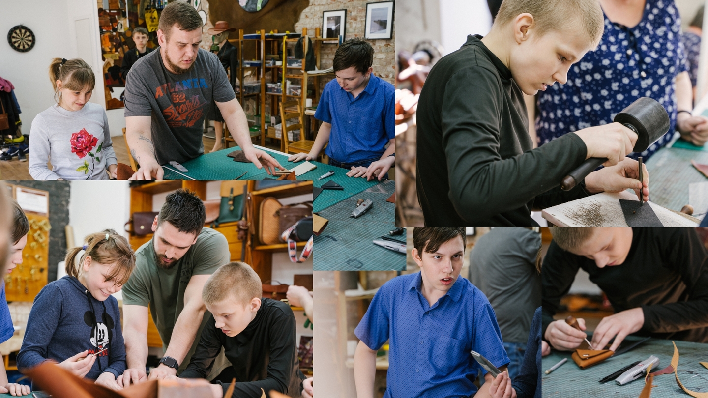 Третий коллаж — профпроба по кожевенному мастерству в мастерской у лучшего кожевника города в креативном кластере «8 студий». Дети узнали чья кожа идет в производство и сколько они могут зарабатывать, делая не самую пыльную работу в такой мастерской.