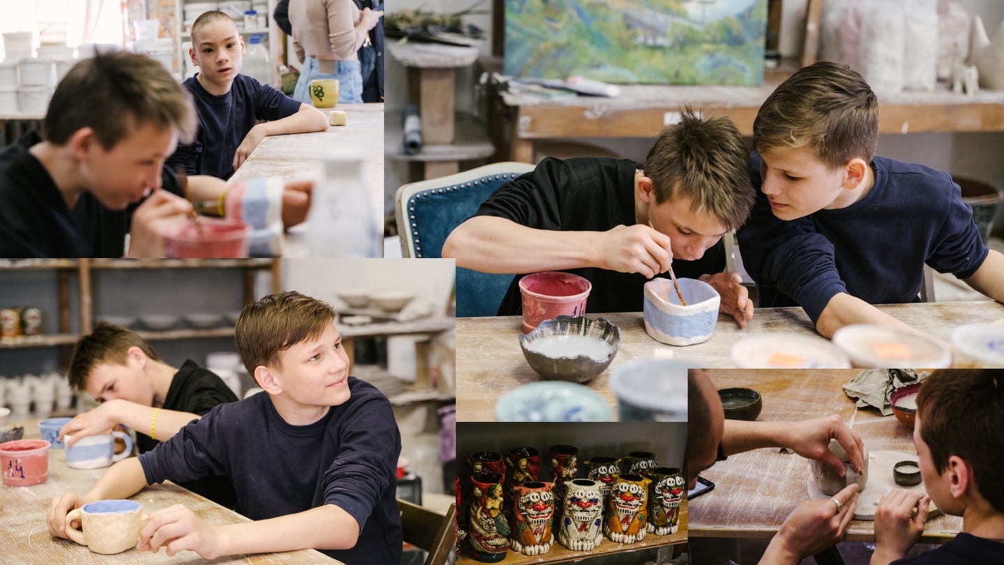 Четвертый коллаж — профпроба гончарного дела на территории кластера Дом 77. Дети увидели настоящие печи, как выглядит глазурь до обжига и разрисовали себе на память кружки.