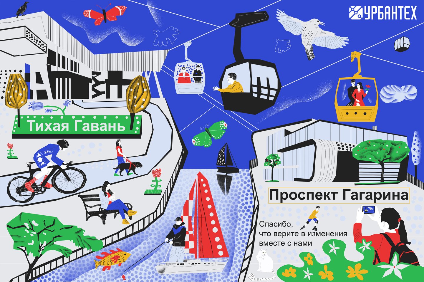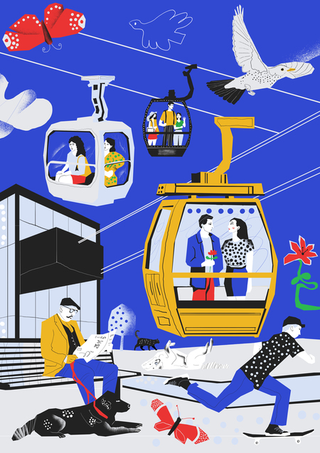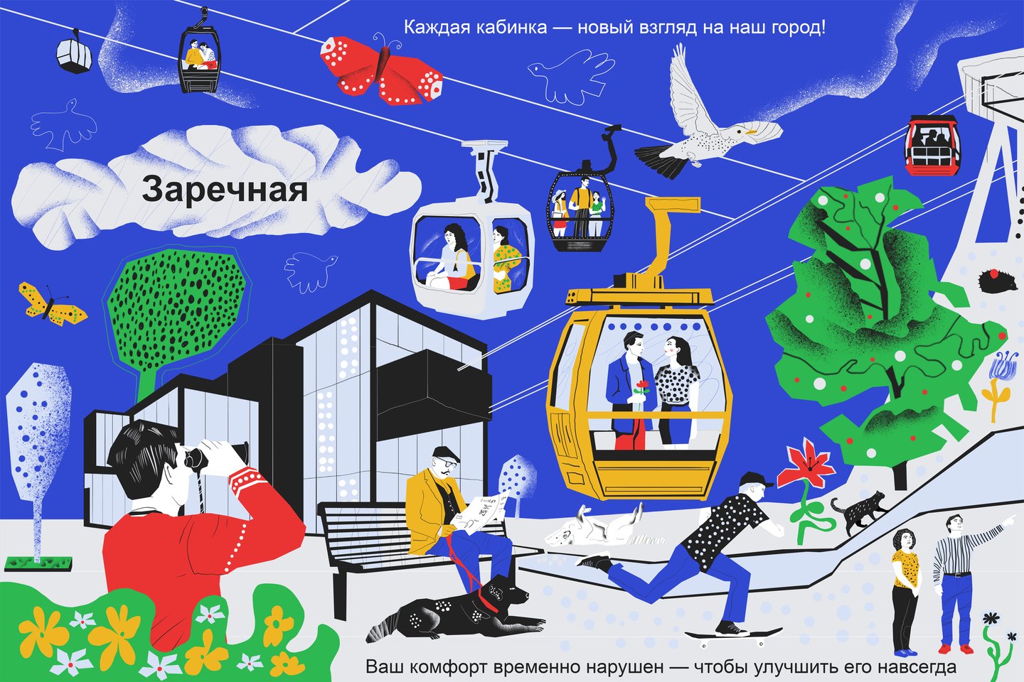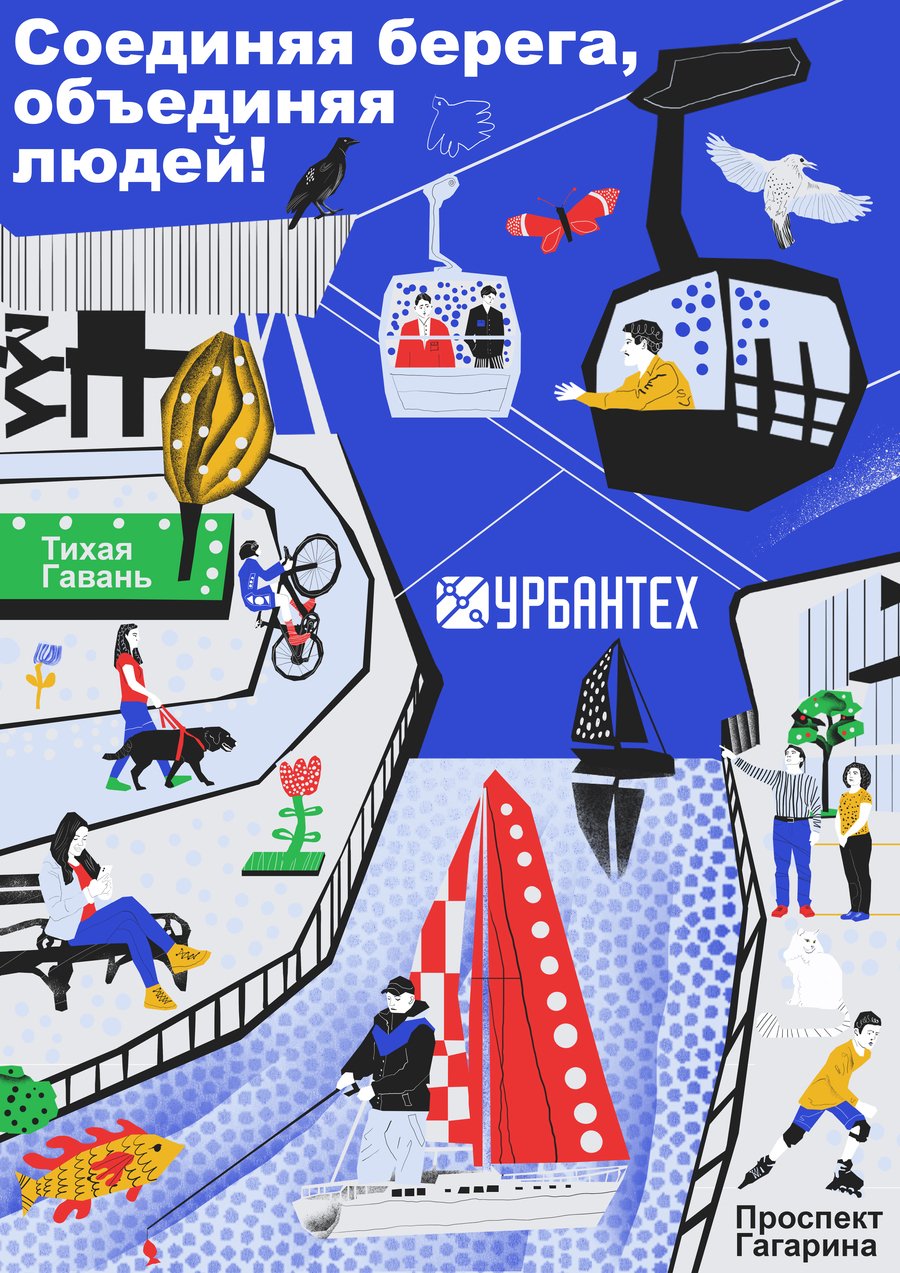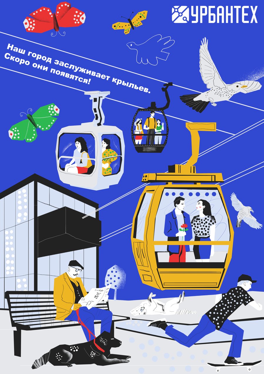 «Каждая кабинка — новый взгляд на наш город» — это не просто слоган, а приглашение к созерцанию, к маленькому откровению на высоте движения. Иллюстрация строится как путешествие: по воздуху — и сквозь город, по линиям канатной дороги — и по нитям городской жизни. Перед зрителем раскрывается панорама, собранная не из достопримечательностей, а из живых деталей: велосипедист на дороге, влюблённые в кабинке, бабочка в полёте, человек с биноклем и тд. Здесь нет случайных фигур — каждая из них как зритель спектакля, который ставит сам город. Архитектура в кадре — словно декорация к повседневной поэзии. Она не отвлекает, а направляет взгляд, подчёркивая маршруты движения и встреч. «Ваш комфорт временно нарушен — чтобы улучшить его навсегда» — произносится с уважением. Это не оправдание, а признание перемен и диалог с теми, кто идёт рядом. Этот проект — про то, как важно видеть: не просто наблюдать, а замечать. Не просто строить, а понимать, для кого и ради чего. А значит — вместе.