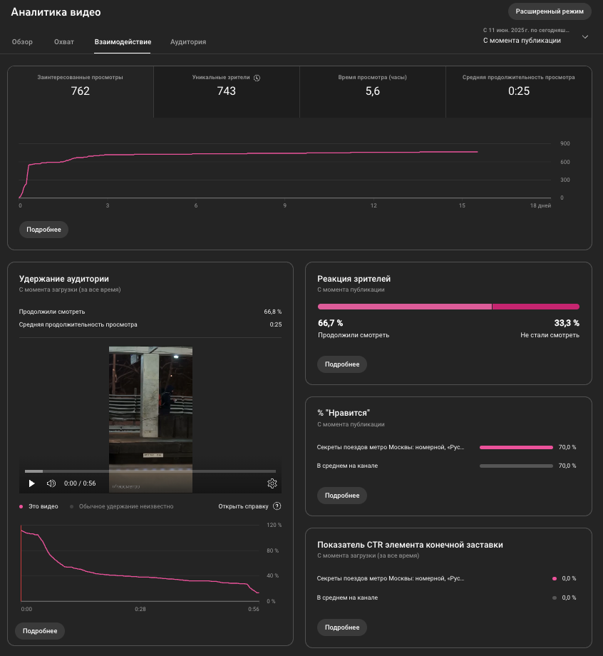 Просмотры: 1207, продолжительность просмотра: 66,8%, уникальных зрителей: 743 Лайков: 7, дизлайков: 3, комментариев: 5