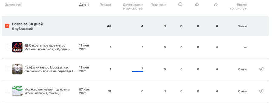 Больше всего просмотров набрала статья на DTF «История московского метро» — 1900 просмотров. Однако стоит учитывать, что значительная часть внимания связана не с темой метро, а с реакцией на сам факт использования ИИ для создания контента. В комментариях было много критики — аудитория DTF в целом негативно отнеслась к сгенерированным материалам и к тому, что проект опирается на нейросети. Это важно учитывать при дальнейшем выборе платформ.