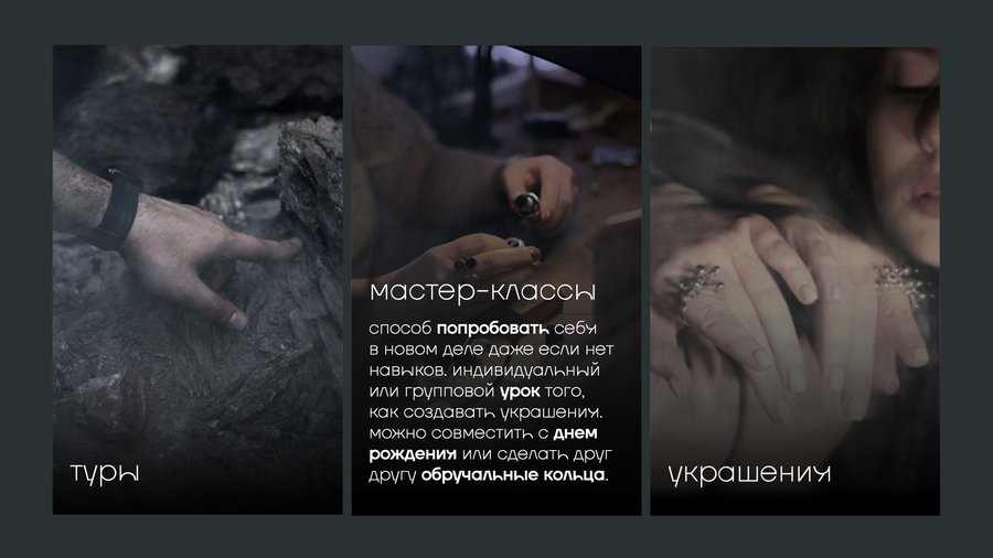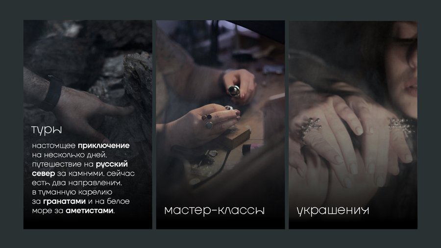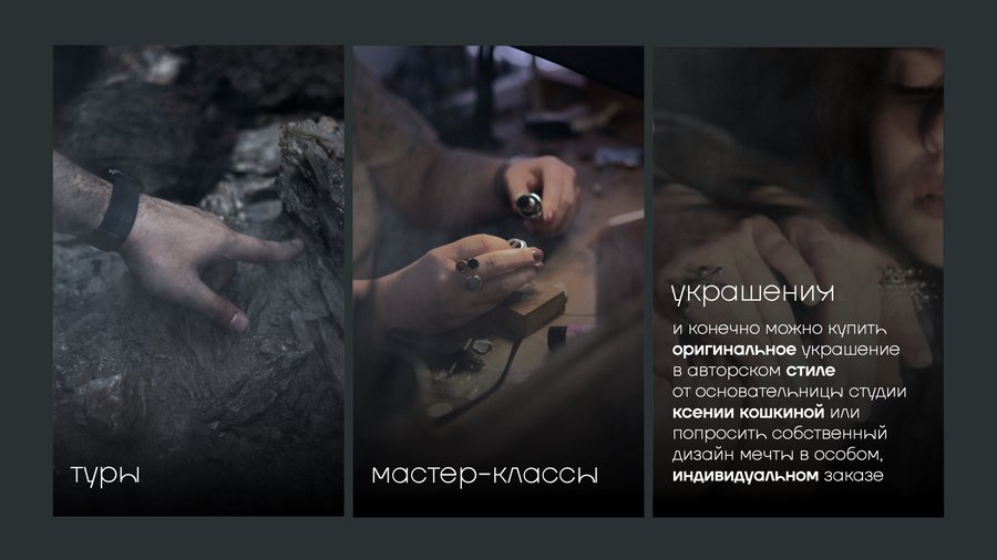 Xenia Koshkina Studio is an unusual jewelry studio that has unique secret tours for grenades, almandins and ametists to the Russian north, copyrighted masters and architecturally sensitive, tactile silver jewelry with semi-precious stones.