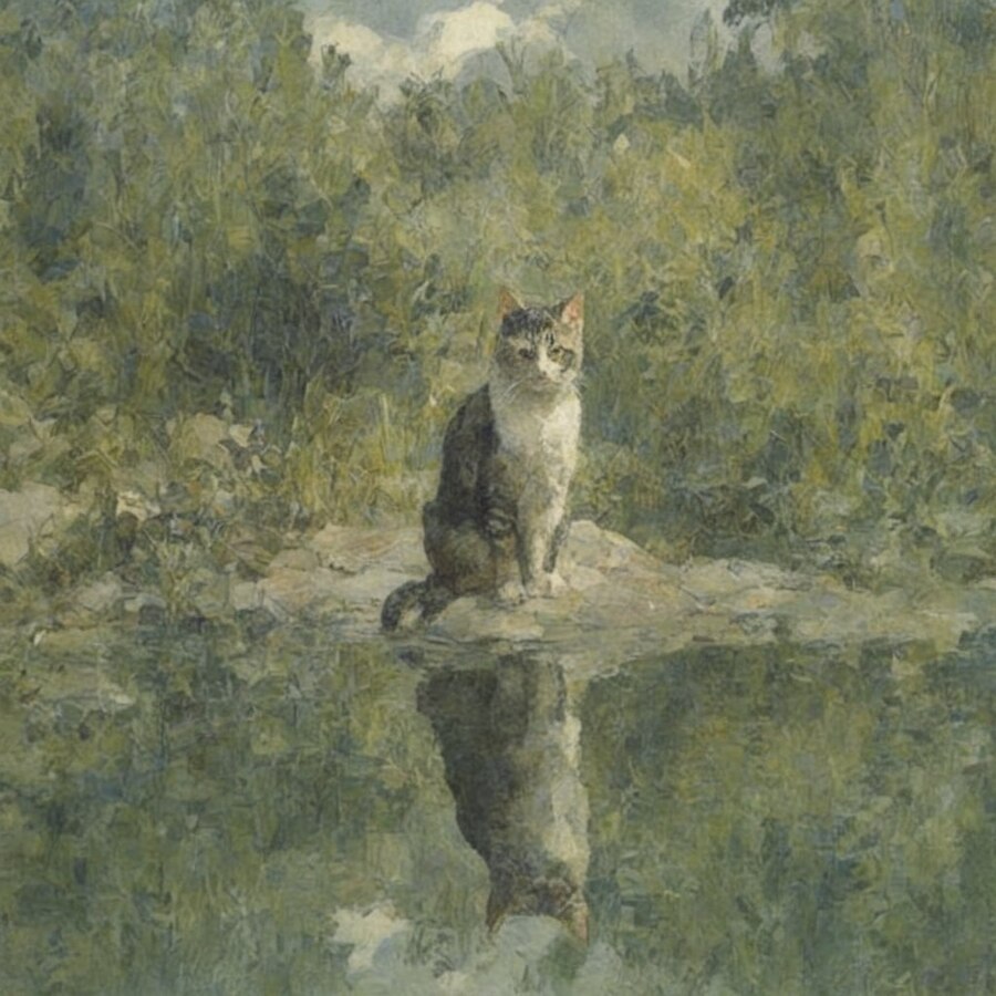 (фотоколлаж в стиле Михаила Врубеля, кошка смотрит на своё отражение в озере (в окружении природы)) Полностью соответствует замыслу — кот у воды, с отражением, природа вокруг. Нейросеть хорошо справилась.