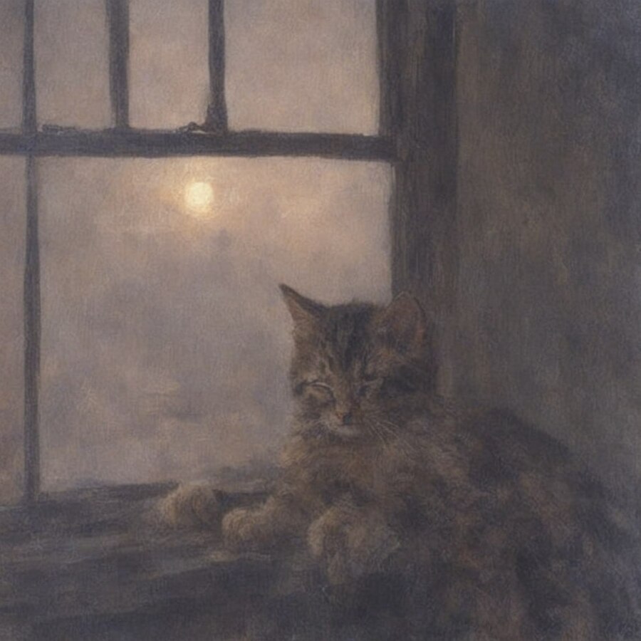 (фотоколлаж в стиле Михаила Врубеля, «Котёнок спит на окне маленького домика тёмной туманной ночью») Котёнок у окна есть, но окружение менее детализировано. Туман и атмосферность переданы хорошо.