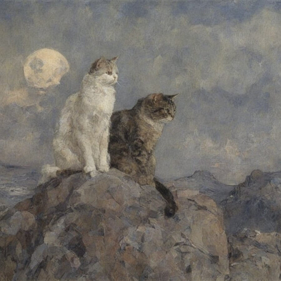 Особенно интересно, что даже без явного описания котов они в каждом случае органично вписываются в сцену. Это показывает, что нейросеть использует не только текст, но и контекст, создавая гармоничные композиции. Итоговые работы выглядят так, будто их написал сам Врубель, но с элементами случайности, присущими генератору.