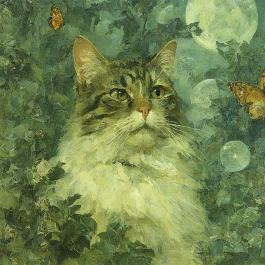 (фотоколлаж в стиле Михаила Врубеля, кошка в окружении густого леса на фоне бабочек и мыльных пузырей) В целом соответствует задумке: кот в лесу, с бабочками и мыльными пузырями. Окружение получилось плотным, детализация на уровне.