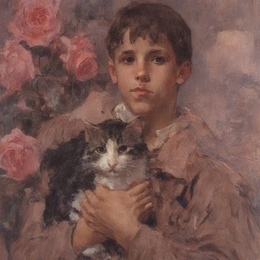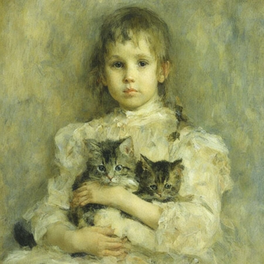 Визуальный анализ. В итоговой серии изображений представлены коты и кошки, с людьми, или без них, в разном окружении, и с разными дополнительными элементами. Главной идеей проекта было узнать, как нейросеть изобразит котов (в стиле картин Врубеля), если давать только описание окружения, или людей которые бы присутствовали на картине с котами. На первом изображении представлена юная девочка, с двумя котятами в руках, изображение похоже по стилю на работы Врубеля крупными мазками, и палитрой цветов. Изначальный промт подразумевал одного кота, который сидел бы у ребенка на руках, возраст кота не уточнялся, как и пол ребенка. На втором изображении мы видим юношу, держащего кота в руках, на фоне роз. Нейросеть сгенерировала изображение по промту практически так как надо было, за исключением того что розы должны были быть не на фоне, вместо них должна была быть одна роза в зубах у юноши. Третье изображение — мужчина средних лет с котом, лежащим у него на голове. Мужчина с котом есть, но кот скорее развалился у него на плечах, а не на голове. В остальном, получилось похоже.