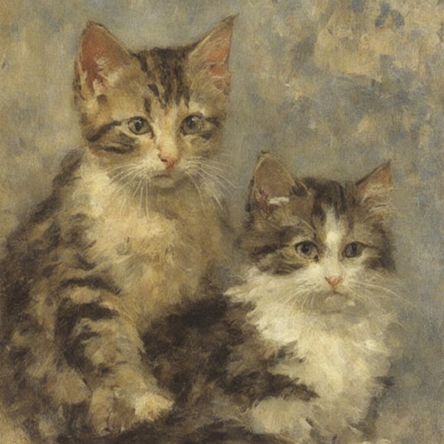 (фотоколлаж в стиле Михаила Врубеля, котёнок и кошка сидят рядом) Здесь получилось два котёнка, без взрослого кота. Но в целом сцена соответствует оригиналу.