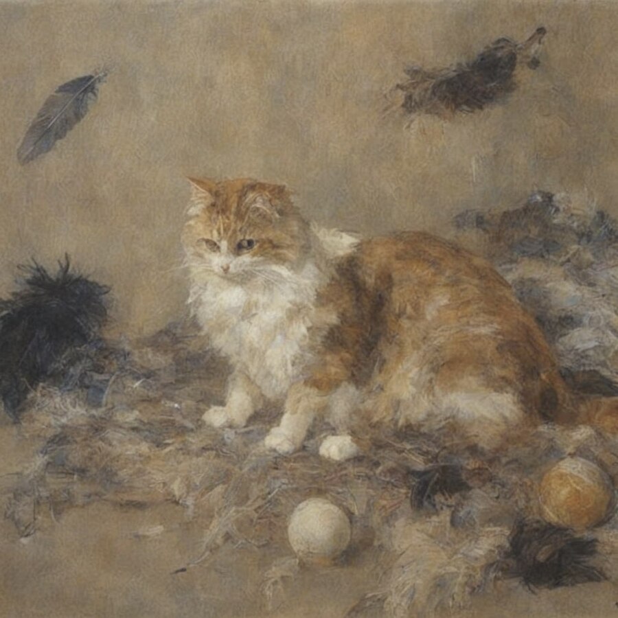 (фотоколлаж в стиле Михаила Врубеля, кошка, играющая с мячом, лежит на полу, вокруг перья и нитки) Кот лежит, есть перья и элементы вокруг, но сам мячик мог получиться не таким заметным. Общая сцена похожа.