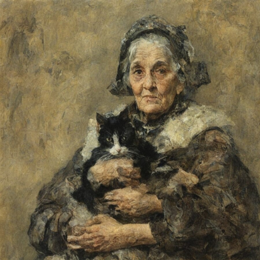 (фотоколлаж в стиле Михаила Врубеля, пожилая женщина с котом, сидящим у неё на плече и держащим в зубах мышь) Бабушка с котом получилась, но кот не сидит у неё на плече и не держит мышь. Вместо этого он у неё на руках, сцена более классическая.