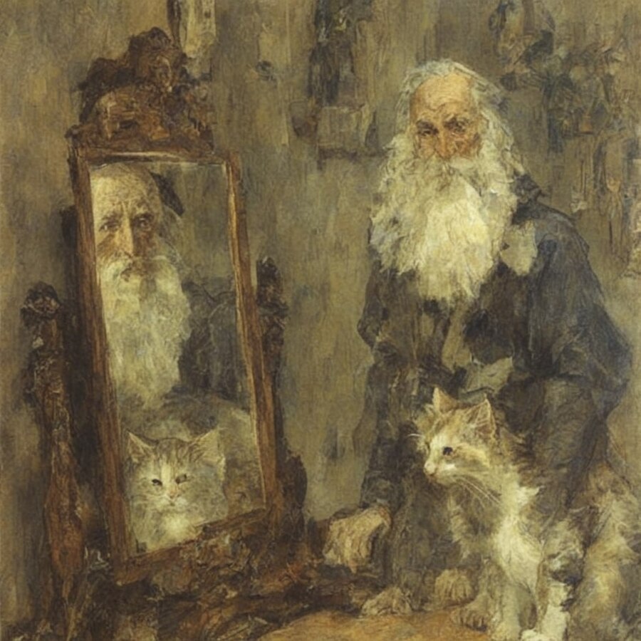 (фотоколлаж в стиле Михаила Врубеля, кошка стоит в удивлении перед зеркалом, старик стоит позади кошки) Кот и зеркало есть, старик тоже, но эмоции кота не такие яркие, как в промте. Получилось скорее задумчиво, чем удивлённо